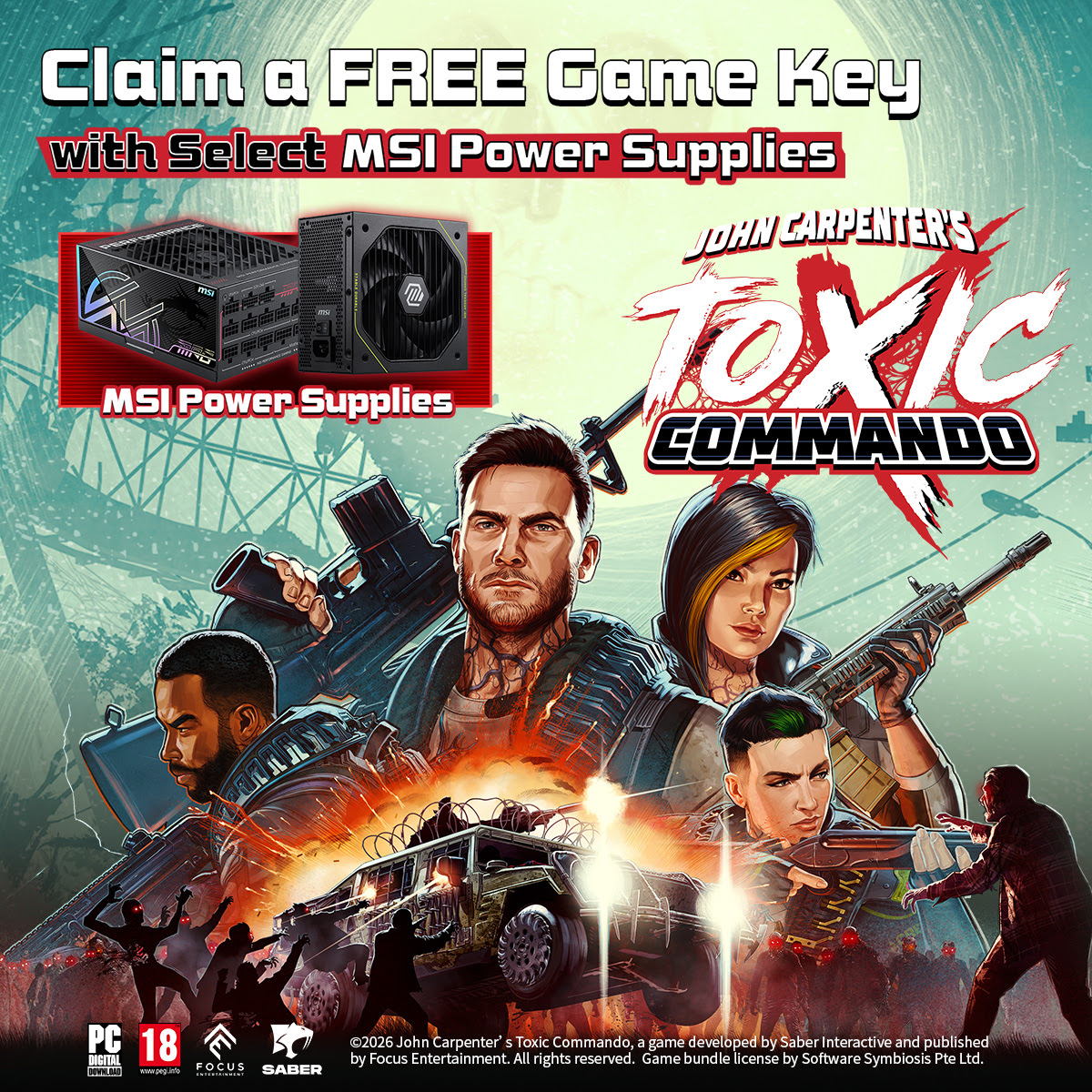 Im Zeitraum vom 12. März bis zum 12. April 2026 können Fans beim Kauf ausgewählter MSI-Netzteile einen kostenlosen Spiele-Key für den Titel „John Carpenter's Toxic Commando" erhalten. Die Einlösung der Keys startet offiziell am 26. März 2026.