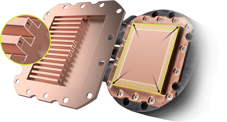 Der Flüssigkeitskühler verbessert die Wärmeableitung der CPU, indem er die Kontaktfläche zwischen dem Wasserkanal und der Kupferbasis des Wasserblocks vergrößert. Das wird durch ein vergrößertes Design mit einer verbesserten Höhe der Mikrokanäle erreicht. Diese Mikrokanalkonfiguration trägt zu einem effizienteren Wasserkühlsystem bei, das den Kühlprozess der CPU optimiert.