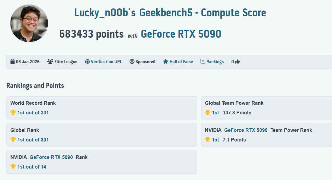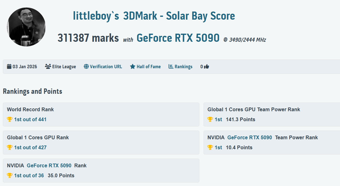 Die GeForce RTX 5090 LIGHTNING sichert sich Spitzenplatzierungen in 17 Overclocking-Benchmarks und stellte zahlreiche Rekorde auf HWBOT und 3DMark auf, wie die entsprechenden Benchmarks zeigen:
